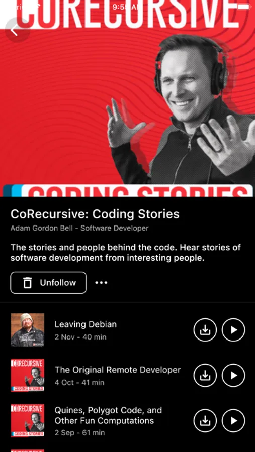 - Download episodes for offline listening.