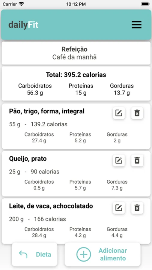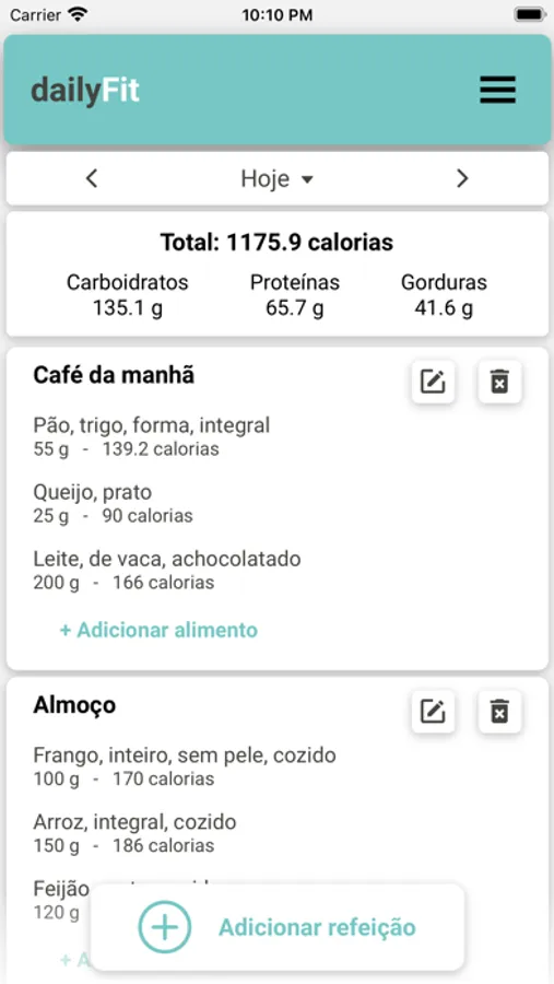 Organize os alimentos consumidos em refeições e consulte a quantidade de calorias carboidratos, proteínas e gorduras consumidos.