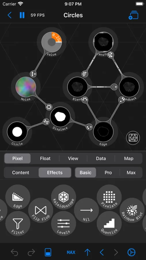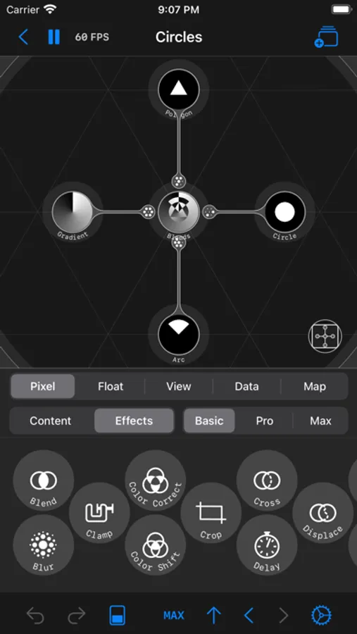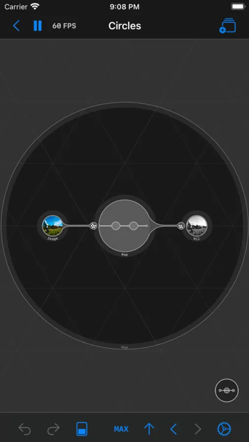 Circles is a node editor for creating live graphics, animations, automations and interfaces. In Circles you can connect nodes that flow in all directions. You can create graphics or camera filters with Pixel Nodes, animate with Float nodes, build a UI with View Nodes and use JavaScript with Data Nodes. There is also a Map Node, where you can go one level deeper and build reusable node flows.