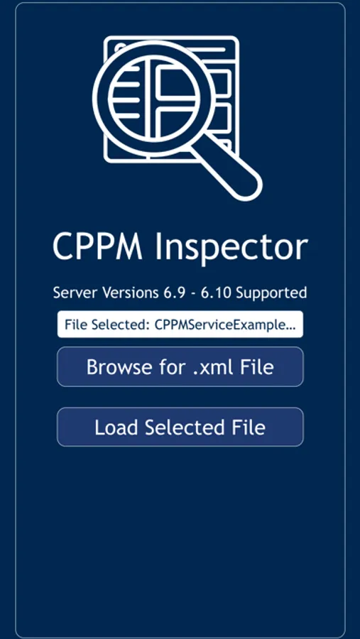 The app works by loading the Services.xml file that is exported from the supported Clearpass Policy Manager server.