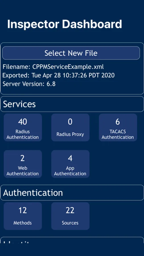 The app does not communicate with the Clearpass server. No special configuration is required on the Clearpass server to use the app. The app only needs access to the exported Services.xml file which can reside in a file location reachable by the device running the app. The information presented by the app is only as accurate and up-to-date as the date/time stamp on the exported Services.xml file. With that said if changes are made to the Clearpass server after the last exported Services.xml file was taken those changes will not be reflected in the app until a new Services.xml file is exported. It is highly advised to double/triple check any information provided by CPPM Inspector as the information provided may not reflect the current configuration on the Clearpass Server. Again...The information presented by the app is only as accurate and up-to-date as the date/time stamp on the exported Services.xml file.