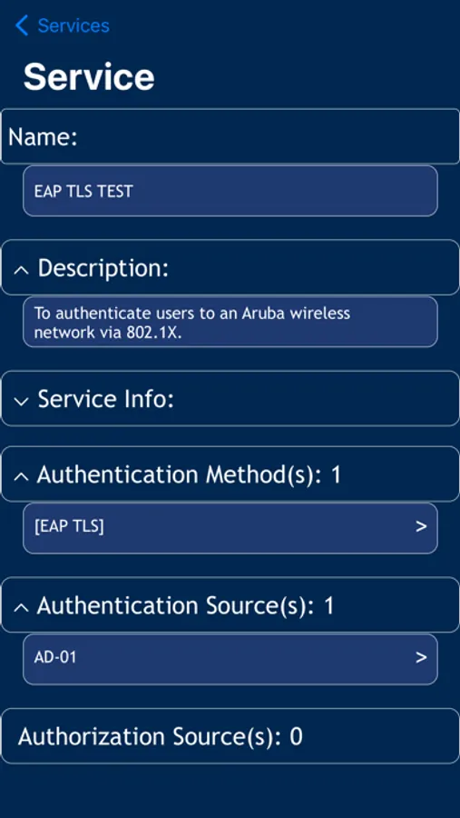 Or perhaps use the app as a quick reference to look up basic Service configuration information without having to log in to the Clearpass Web Console.