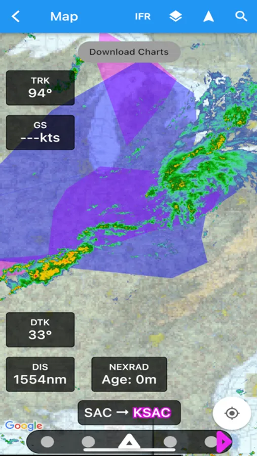 Aviation navigation made simple and affordable. All VFR, low-altitude IFR and instrument approach charts for the continental United States, with full flight planning, including support for airway navigation. Overlays for Nexrad, METARs and AIRMETS/SIGMETS improve flight safety, and detailed airport information (runways, frequencies, fuel, weather, NOTAMs) is at your fingertips.