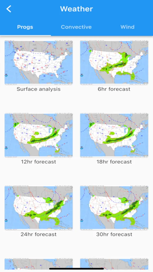 METAR, TAF, AIRMET, SIGMET, Prog charts, Convective Outlook and Wind are available as graphical and/or textual information. METARs and AIRMETS/SIGMETS can be overlayed on the map using the Layers button. Airport information shows METARs and TAFs in plain English, and Prog charts, Convective Outlook and Wind graphics for different times and altitudes are available as full screen graphics.