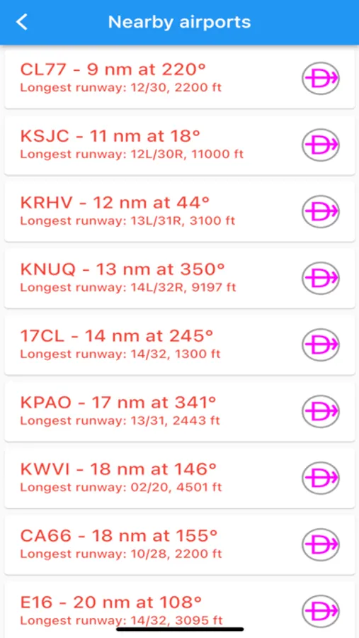 Nearby airports are shown in green or red to indicate whether or not those airports are likely reachable in a no-wind glide.