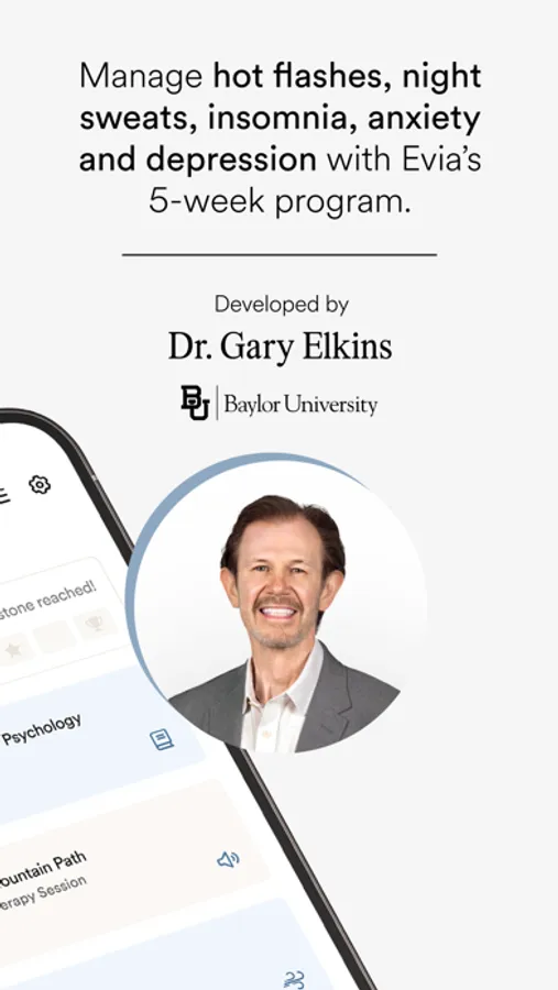 The Evia hypnotherapy program is an easy and effective way to manage menopausal hot flashes naturally. With a program developed by world-leading neuroscientist and menopause researcher, Dr. Gary Elkins, Evia helps you learn how to calm the body's stress response and self-manage hot flashes with evidence-based hypnotherapy.