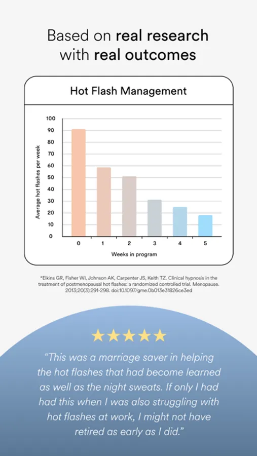 In a recent study by Dr. Elkins, published in the International Journal of Clinical and Experimental Hypnosis, women who completed a similar hypnotherapy program reduced their hot flashes by 70-80% after five weeks with continued practice.
