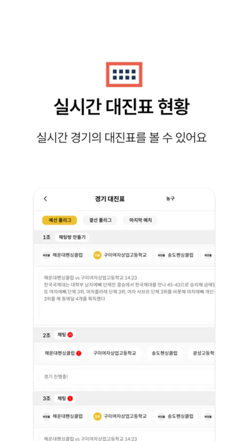 - 대회 공지 및 실시간 대진표 확인이 가능합니다.