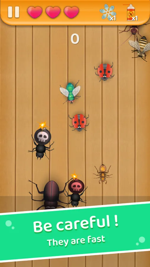 The game is really easy, just tap on the insects to smash em. You have 3 hearts, each time you let an insect go through or when you press on bomb bug, you'll loss a heart. Try smash em as fast as possible but also try avoiding the bomb bug.