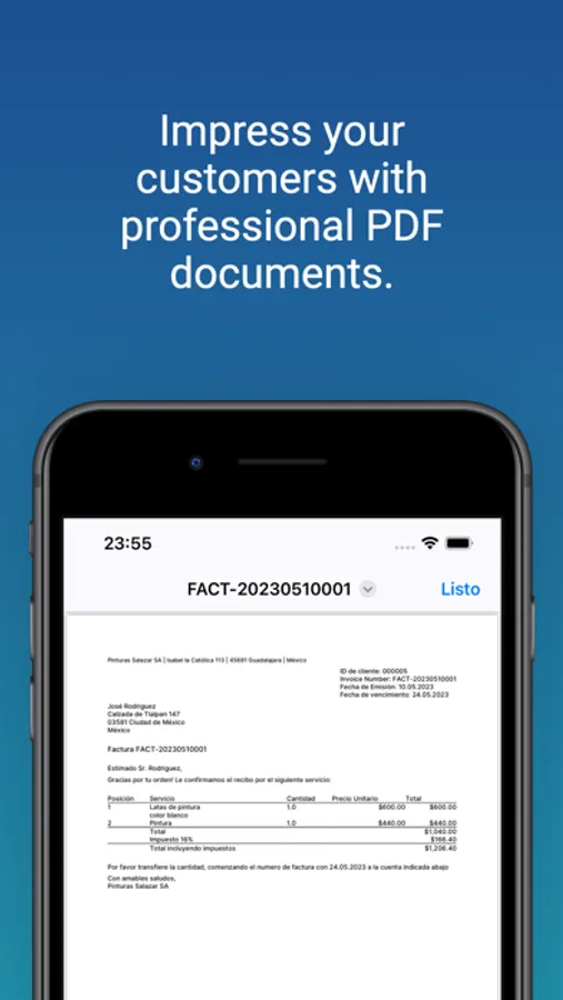 Impress your customers with clear invoices, estimates and receipts. All documents can be created in seconds and sent via email, Whatsapp or other services.