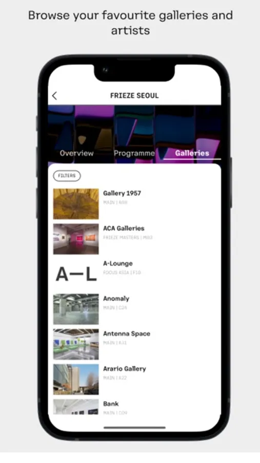 Make the most of your visit by exploring the fair events programme and any perks exclusive to Frieze members. Discover what galleries, museums, cultural institutions, restaurants and Frieze partners have in store during Frieze Week; and navigate the fair with ease by using the mobile-optimised venue floorplans.