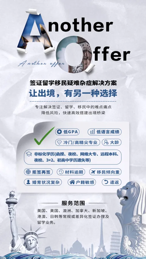 Another offer是一家专注于出境一站式服务的机构,专注解决各类留学、签证及移民中的难点痛点