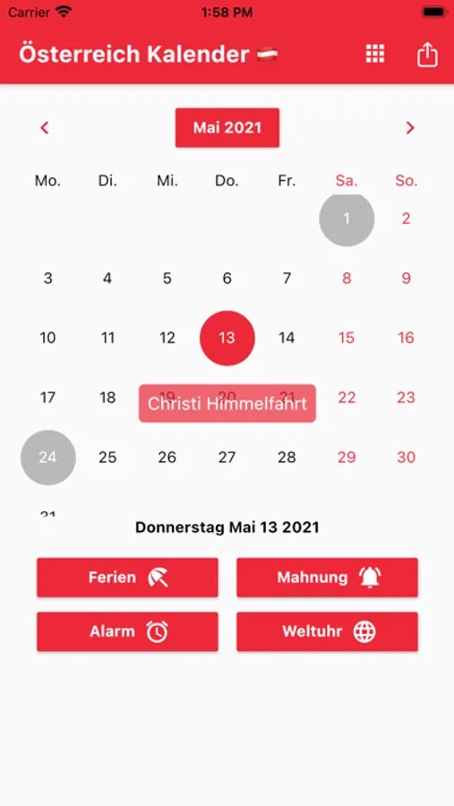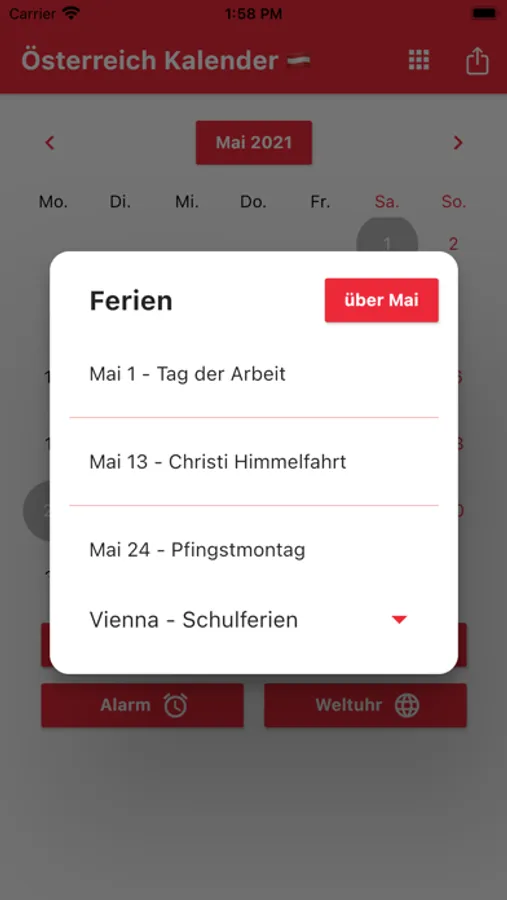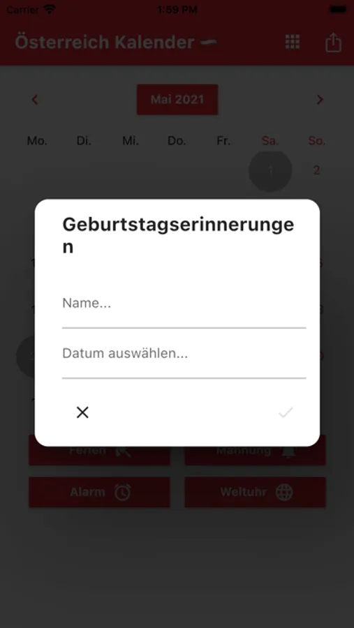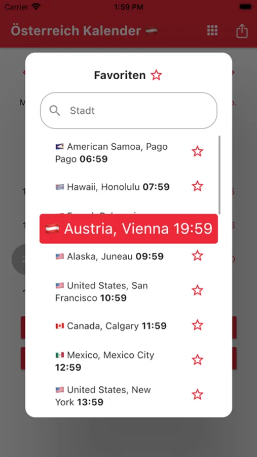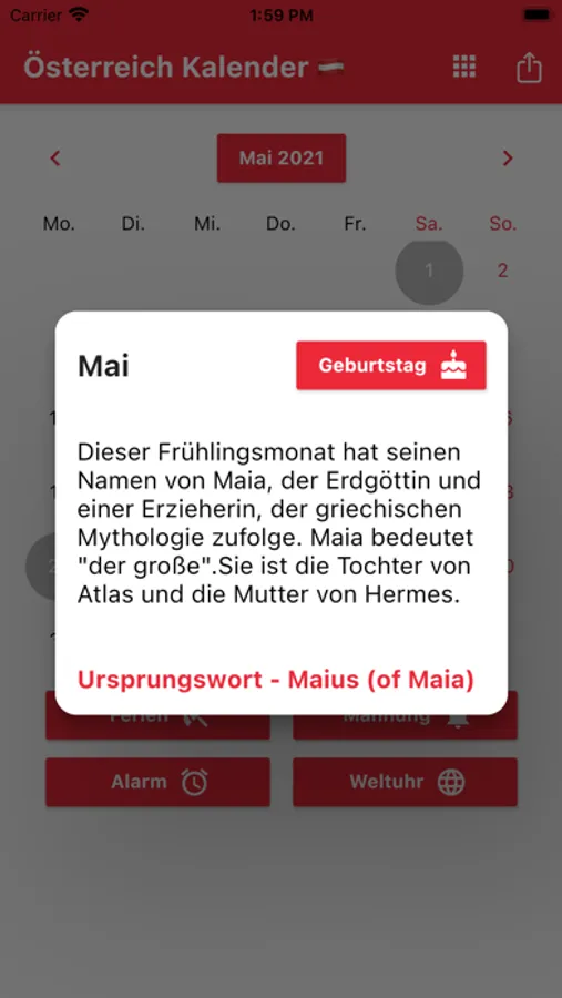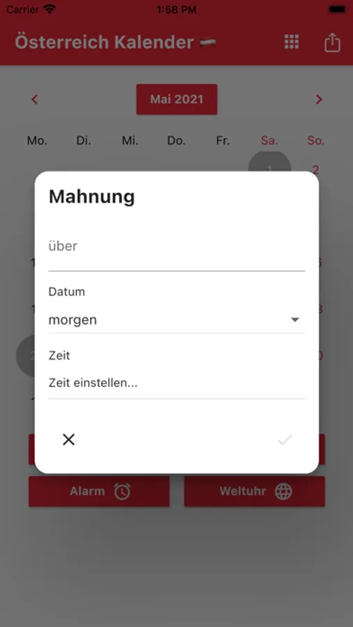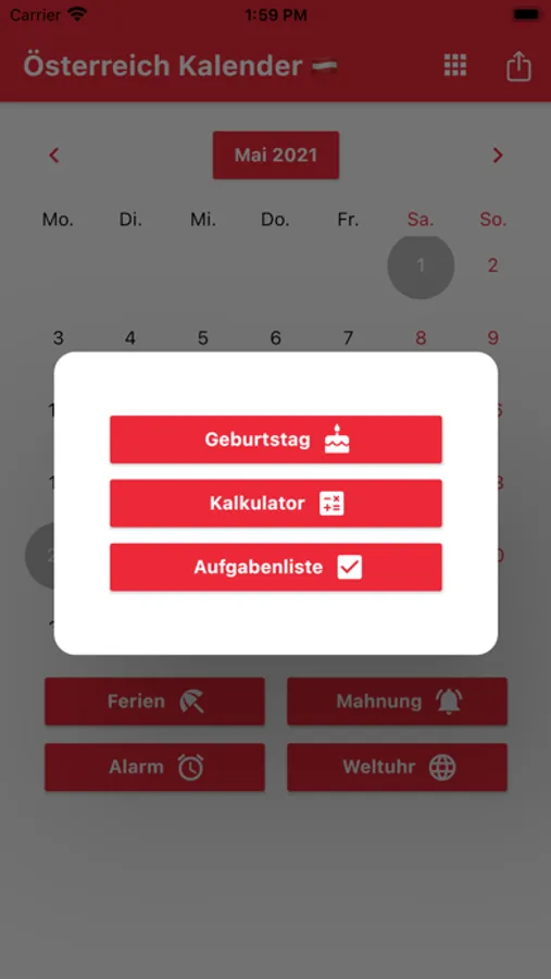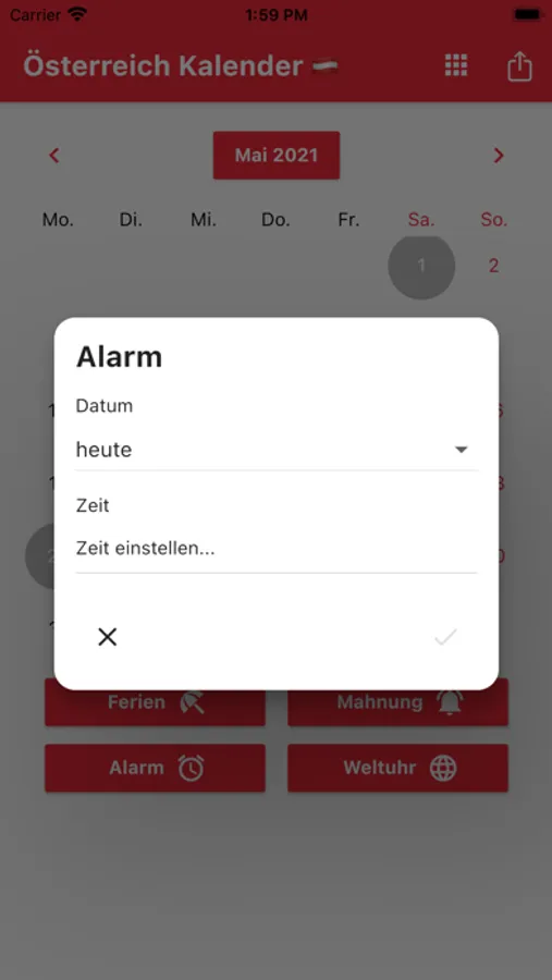 Sie können Erinnerungen festlegen und zur richtigen Zeit benachrichtigt werden. Wir erinnern Sie gerne an Österreich Urlaub. Sie können Geburtstage Ihrer Freunde und Familien registrieren, um im Voraus benachrichtigt zu werden. Praktische Dienstprogramme wie Taschenrechner, Weltzeituhr und Alarm sind enthalten. Die Weltuhr zeigt die Uhrzeit in verschiedenen Städten auf der ganzen Welt an. Unser Kalender enthält eine To-do-Liste mit der Geschichte der Ursprünge jedes Monats.v Österreichische Ortszeit. Übersetzen.