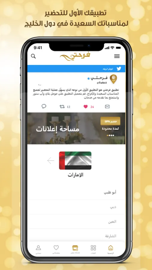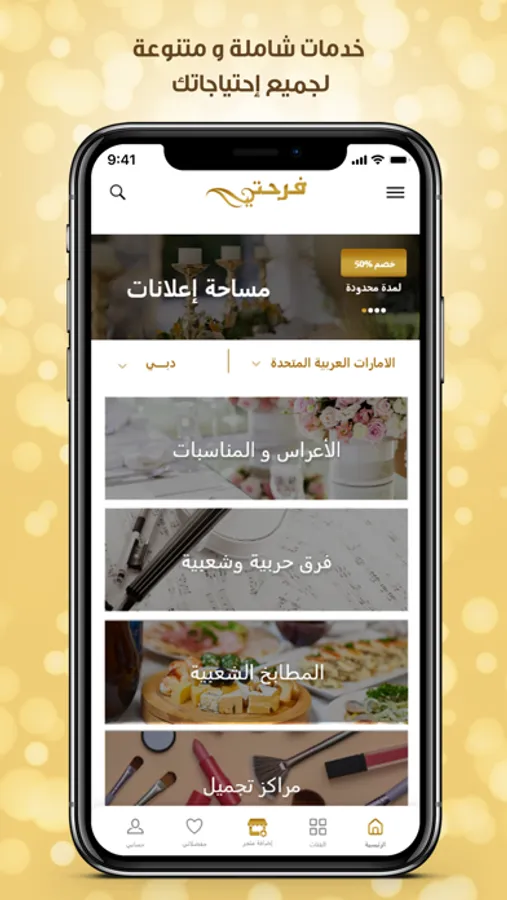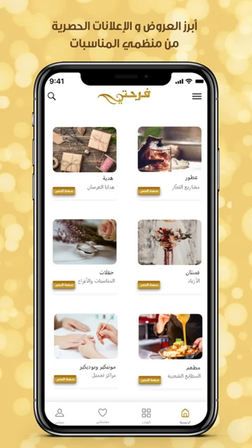 تطبيق فرحتي يجمع لكم عدد كبير من مزودي الخدمات المتخصصين بإحياء المناسبات.. ابتداء من القاعات والخيام والمطابخ والفرق الشعبية والازياء ومراكز التجميل انتهاء بمعارض التجار وهدايا العرسان..