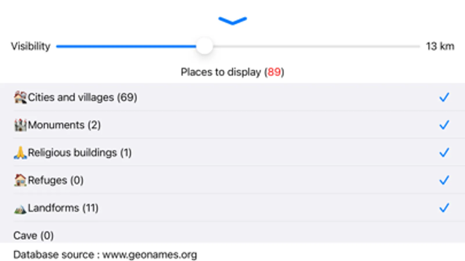 Point your device to identify landscape elements around you: towns, villages, peaks, passes, water bodies, monuments, islands, lighthouses…