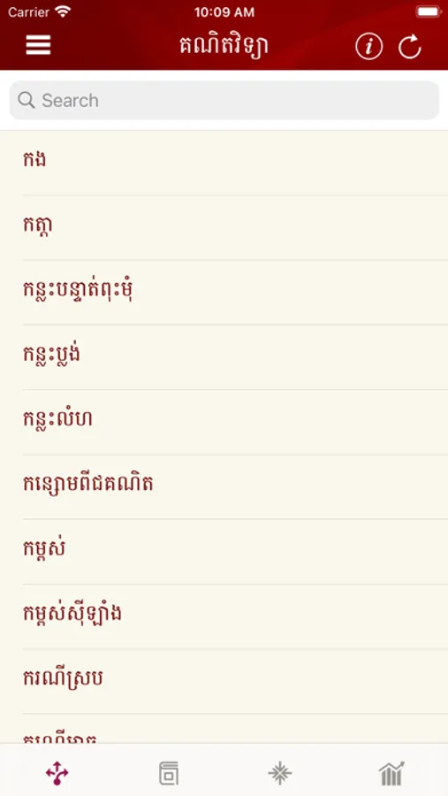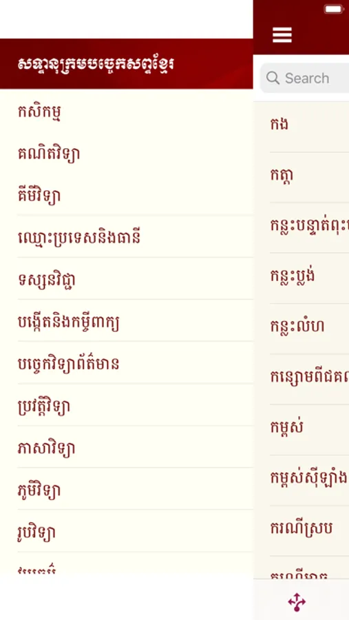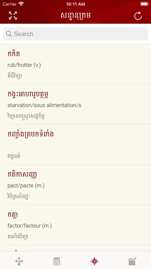 Searching for new words or terminologies digitally by using the internet or a smart phone application is easy and time-saving. Everyone who wishes to easily search for new root words or technical terms which match to English and/ or French words approved by the National Council of Khmer Language can simply use a smartphone application. Everyone can search for technical terms on a computer or on a smartphone.