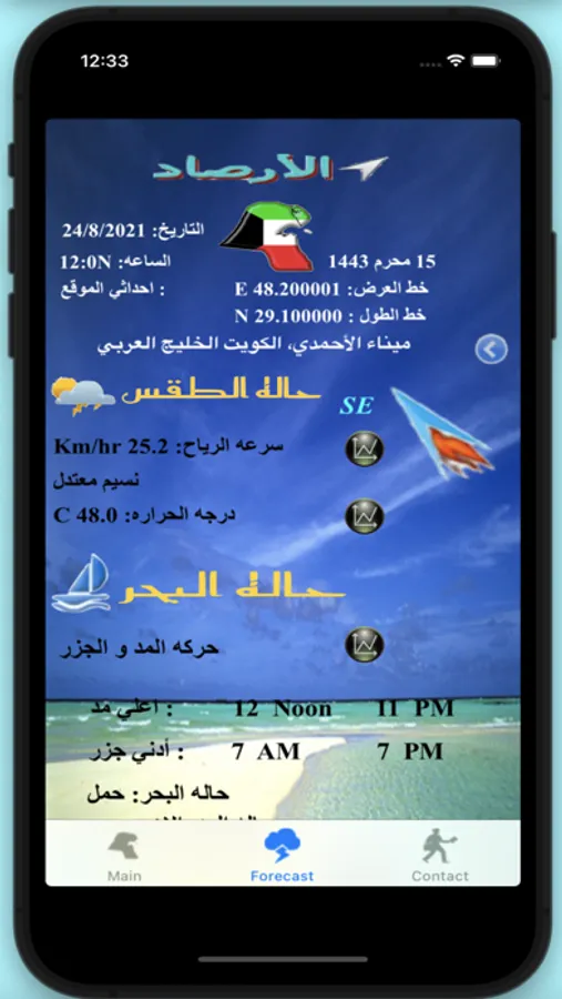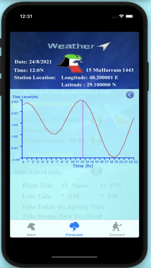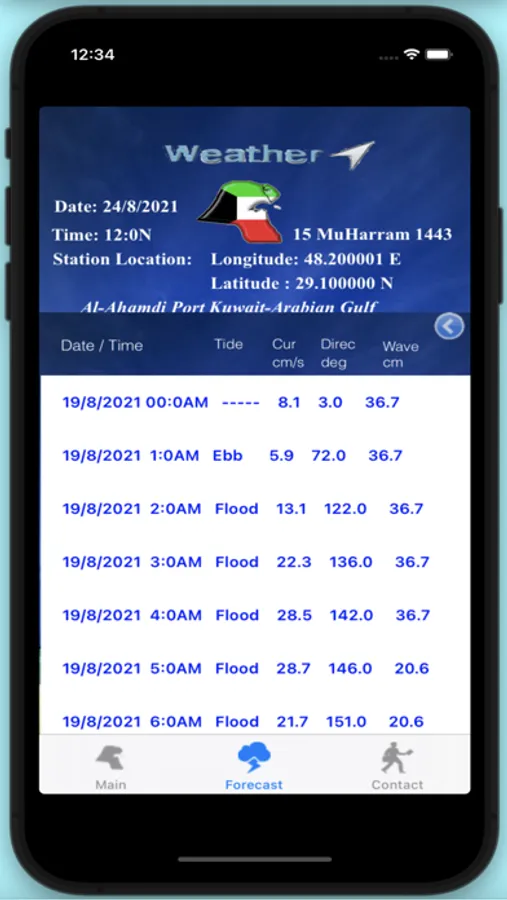 نشره الأرصاد البحرية و الجوية لحركه المد و الجزر و التيارات البحرية وارتفاع الامواج لمياه دوله الكويت في الخليج العربي و التحديثات لنشره الأرصاد البحرية وهي بالساعة
