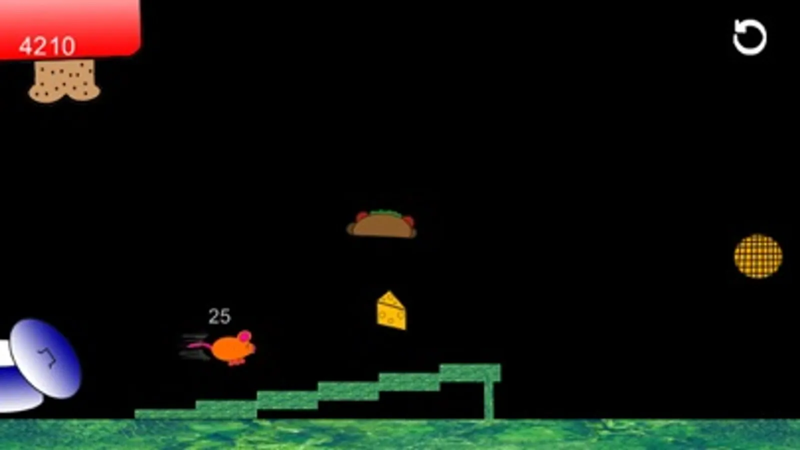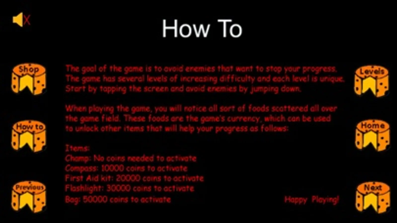 The goal of the game is to avoid obstacles by tapping the screen to move forward. The game has several levels of increasing difficulty and each level is unique. You will notice all sort of foods scattered all over the game field. Collect these foods which are the game’s currency and will help you to unlock other items that will help your progress: