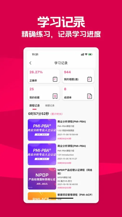课程记录/做题记录:精确到年月日,可按学习计划实现精确的学习及做题练习,实时了解自己的学习进度
