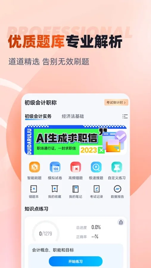 初级会计题库内含考点练习,全国通用卷以及地区卷模拟练习,以及按照固定考试比重的随机式的抽题的真题考场,成绩单实时记录考试数据,一点一滴的反馈考生近期学习状态以及自我正确率的提升,大大的给予考生通过考试的信心。