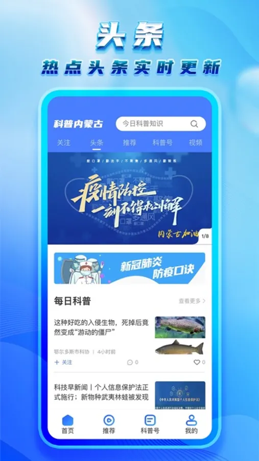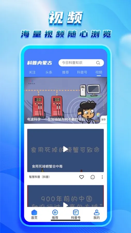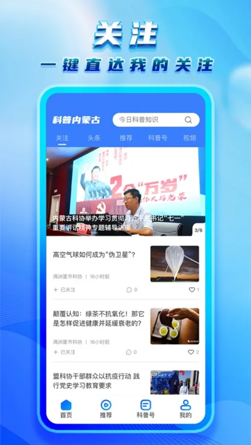 主要用于向用户提供免费的科普知识宣传,让大家了解更多科普知识,,平台细分为关注、头条、推荐、科普号几大板块。内蒙古12盟市下设12科普号,可以各自上传科普知识。