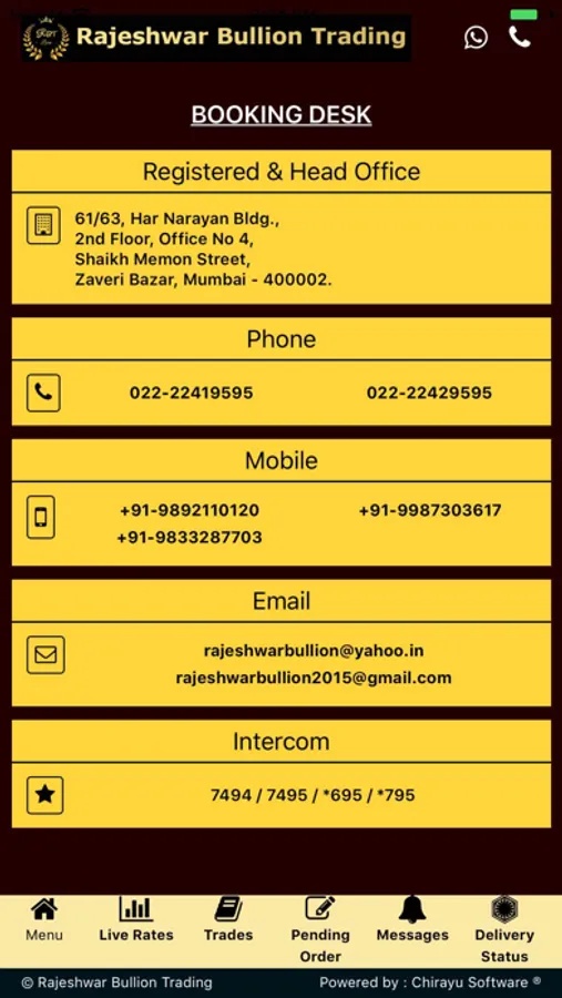 The contact details of our company such as an address, telephone numbers, mobile numbers, email I'd, website details are all mentioned under BOOKING DESK