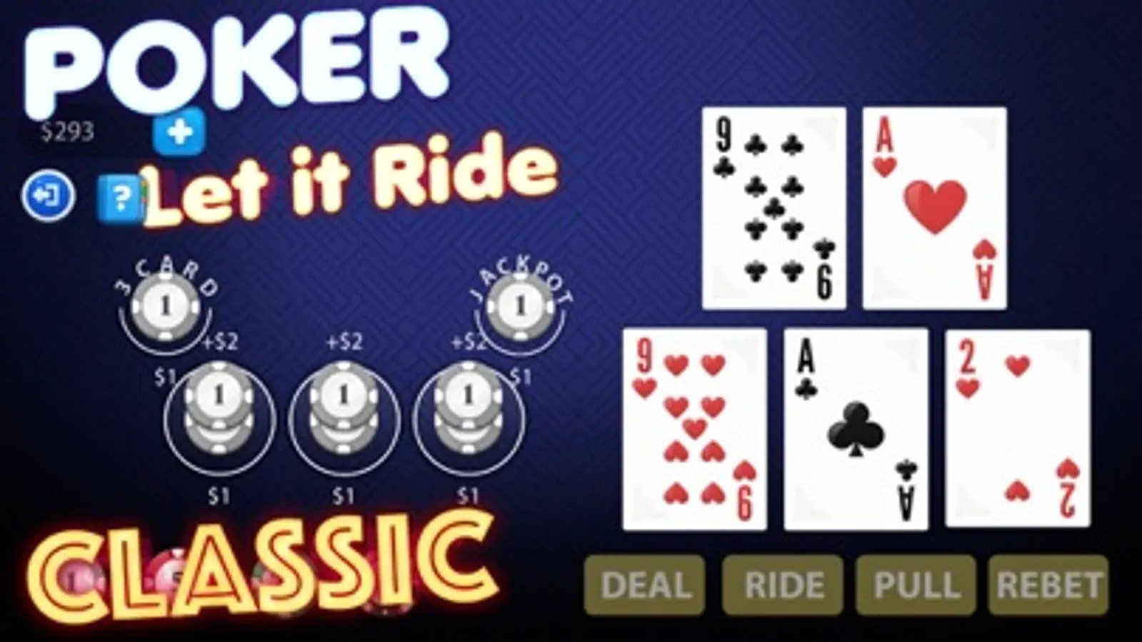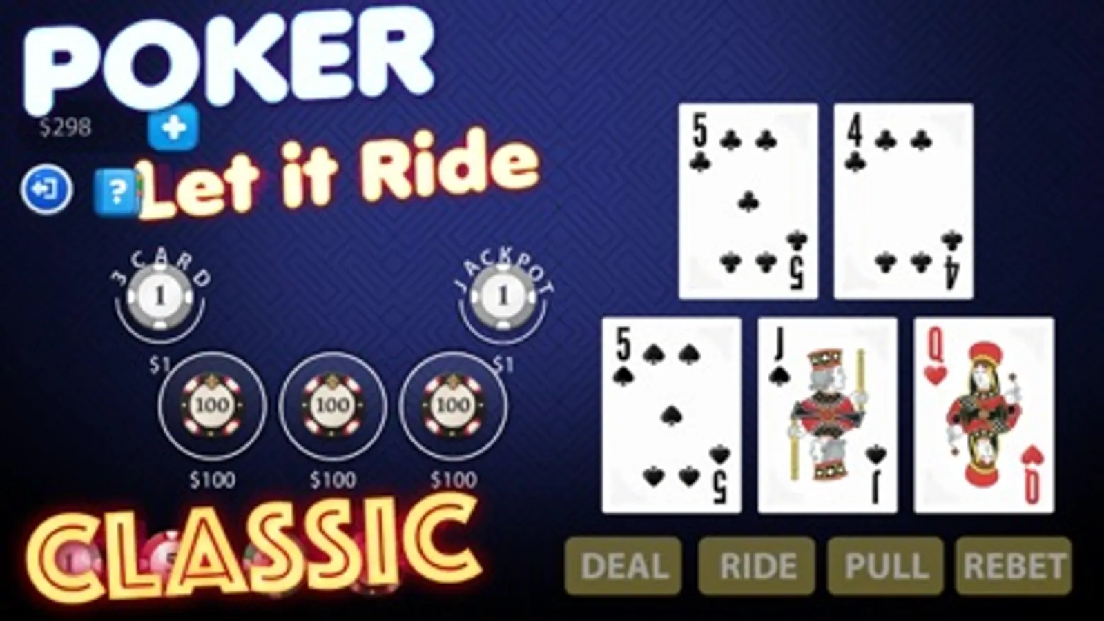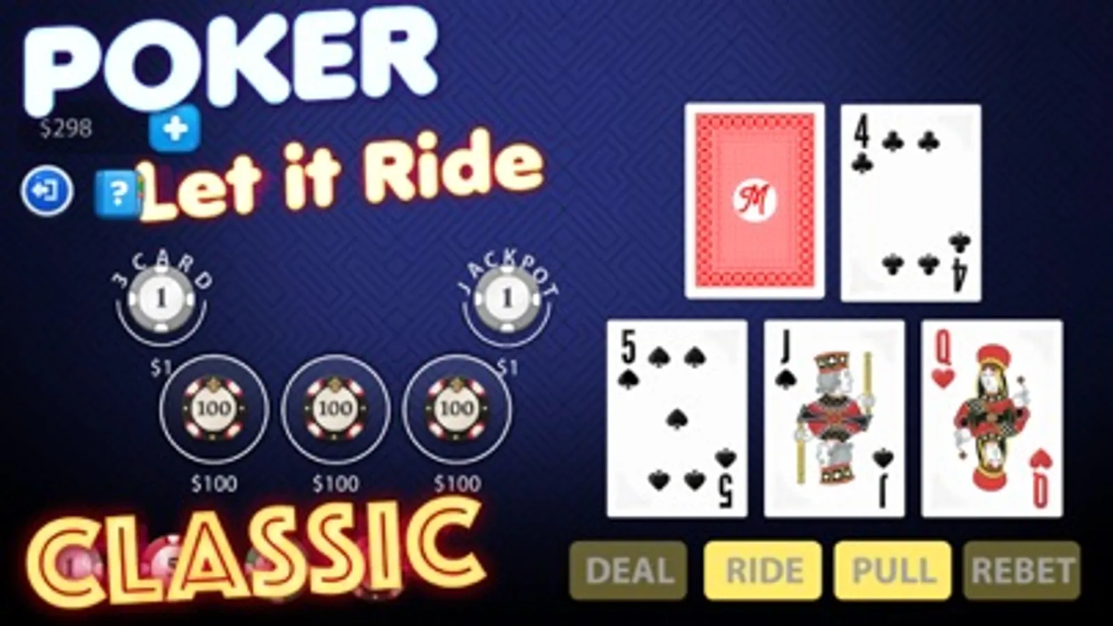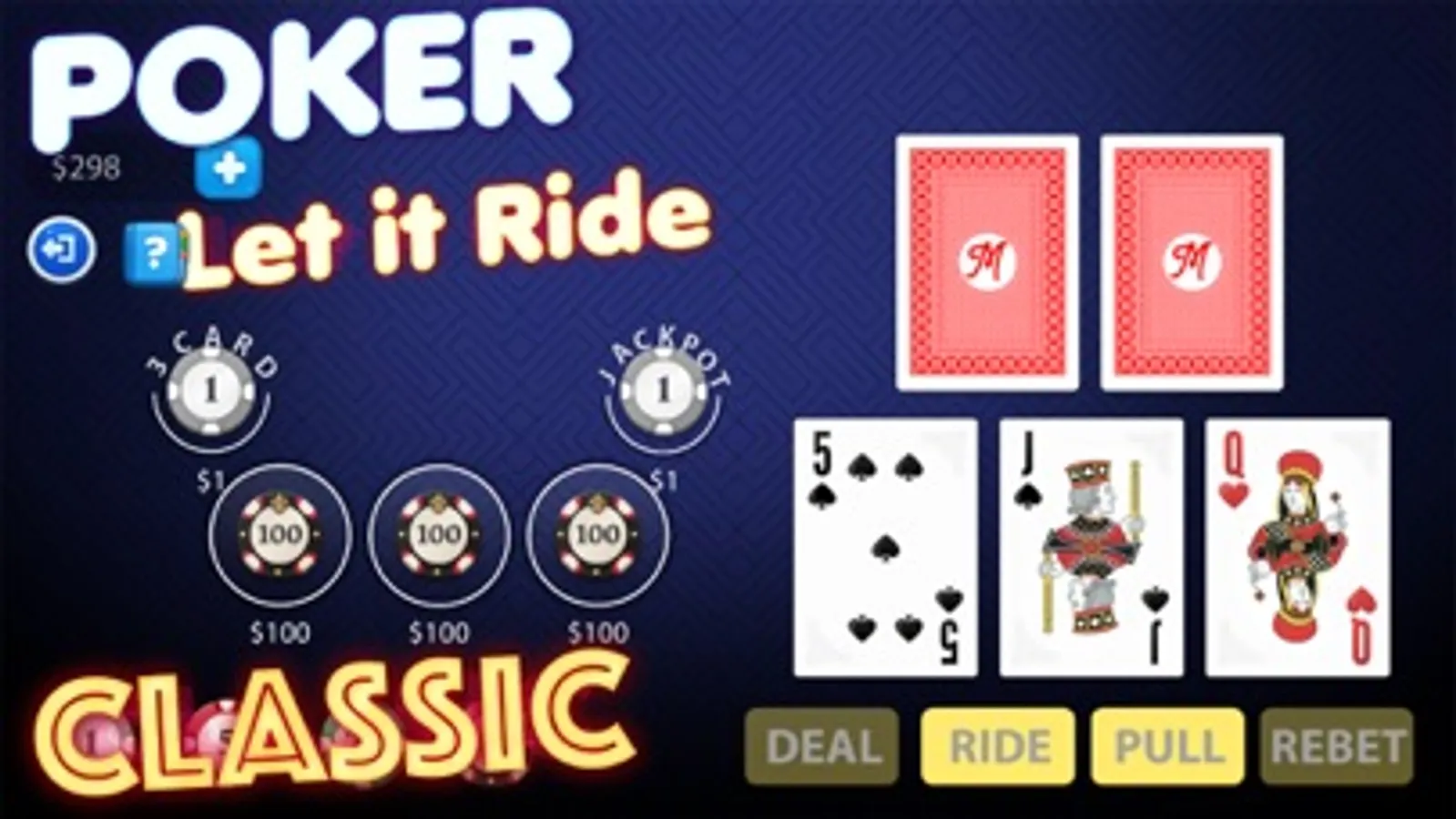 Let It Ride is a variation of five card stud poker. It is based on player’s three cards and two community cards where you can Pull Back or ‘Let Them Ride’ based on how strong your hand is. There is no need to worry about beating dealer’s hand or wagering against other players.