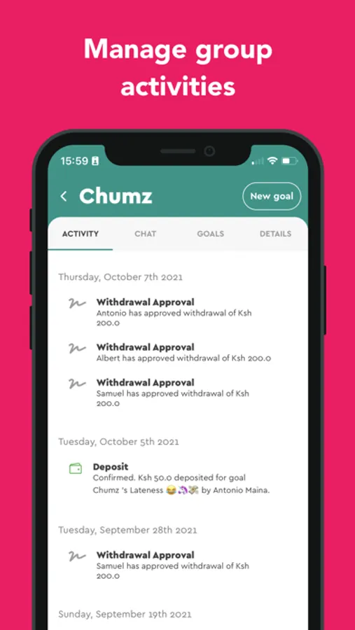Chumz App enables you or your group to form a savings and investment culture through mobile money by enabling you to create a goal with a visual image, set reminders for when to save, get feedback on your savings progress and enable accountability for savers by showing what everyone has saved. The App allows you to save any amount you would like to save.