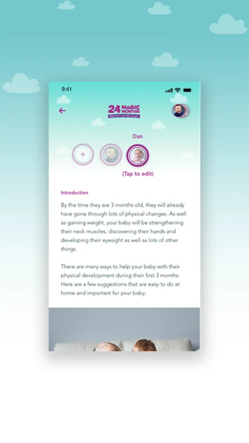 24 Magic Months allows parents to add multiple children up to the age of 2 years and provides child development information that is relevant to that child’s profile.