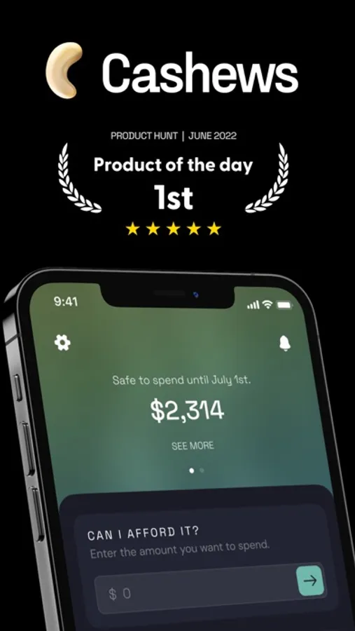 Cashews connects to your bank accounts, analyzes your income & expenses, then a predictive cash flow algorithm lets you know how much Spendable money you have left.