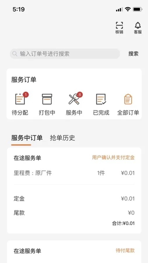 【服务订单】主要为商家处理服务单时所用功能,包含各类服务流程,商家可随时随地进行抢单、分配、查询等操作。