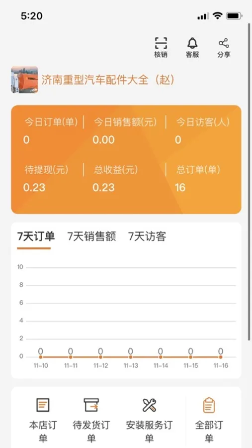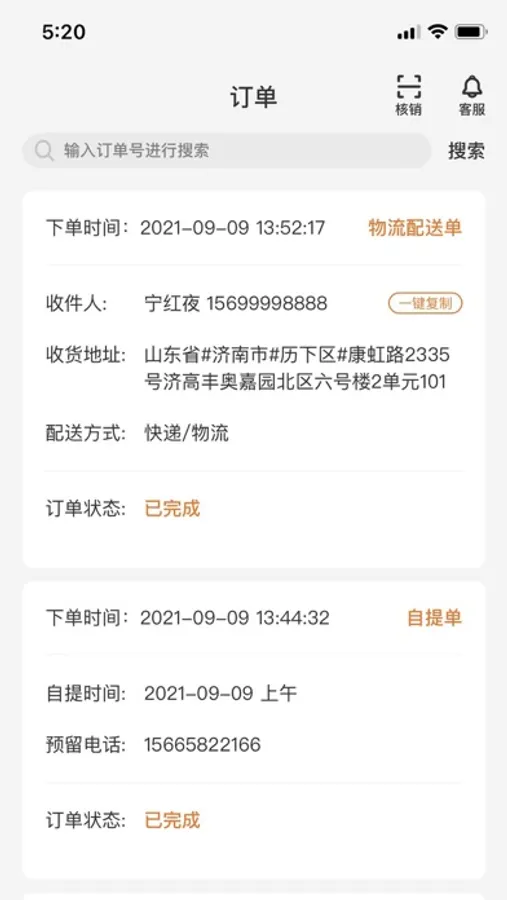 【订单】主要为商家在处理商品订单时所用功能,包含发货,核销,搜索等功能,同时商家可查看近期订单和订单完成状态。
