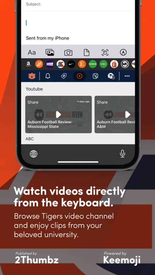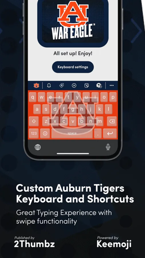 Auburn Tigers Keyboard is the officially licensed fan app for enjoying the full Auburn Athletics experience. This app is owned and published by 2Thumbz, a leading mobile app development company and a trusted collegiate publisher since 2003.