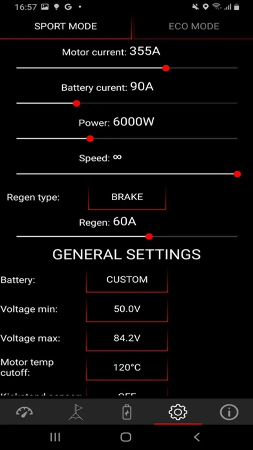 The App allows users to adjust the Controller`s power, speed, and other safety limits according to the Battery they use (Stock, Modified, Custom), they can keep or disable the e-bike`s factory settings (kick-stand sensor, crash sensor, power mode button, stock display, and brake switch) and monitor and share their riding-logs.