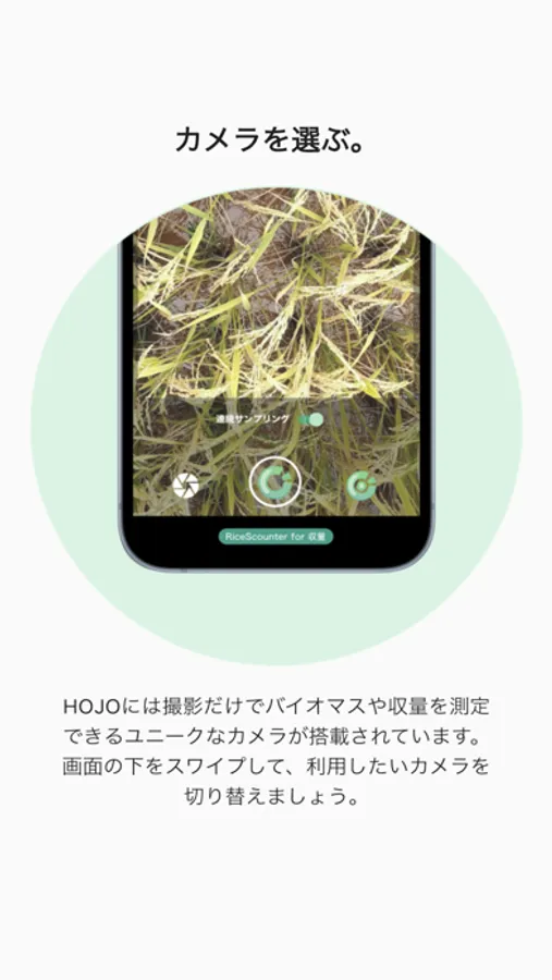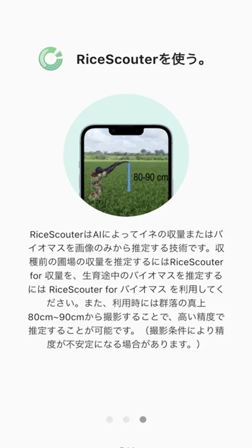 ・RiceScouterはAIによってイネの収量またはバイオマスを画像のみから推定する技術です。収穫前の圃場の収量を推定するにはRiceScouter for 収量を、生育途中のバイオマスを推定するには RiceScouter for バイオマス を利用してください。また、利用時には群落の真上80cm~90cmから撮影することで、高い精度で推定することが可能です。(撮影条件により精度が不安定になる場合があります。)