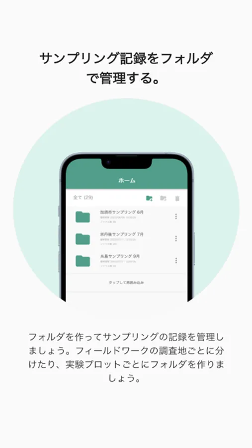・サンプリングの記録をフォルダに分けて管理できます。フィールドワークの調査地ごとに分けたり、実験プロットごとにフォルダを作りましょう。