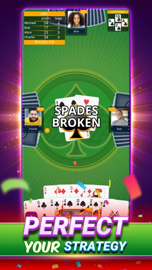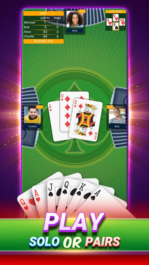 Master the spades card game by bidding nil or blind nil, learn how to break spades, and hone your spades strategy. Compete to win real-world prizes! Play uninterruptedly without ads!