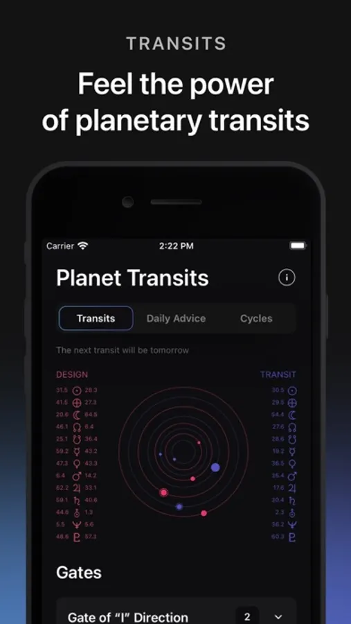 • Access current planetary transits of Human Design and their impact on the human body and lifestyle (check daily activations of new gates and channels)