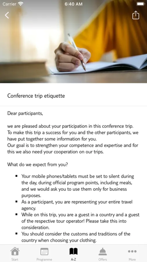 After a log-in via an event code, which you will receive from us with your travel documents, you will gain access to the event. Click through the complete program and find all important documents for direct download.