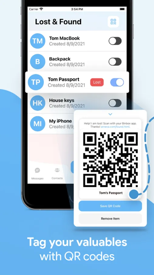 Binbox Messenger helps you find your lost valuables easily. Simply tag your valuables with a QR sticker. When someone finds your lost item, you get a message right in Binbox Messenger! And because tags are simply made of paper/plastic, there's no fear of someone tracking your location. You can generate tags freely in the app yourself. Or, else purchase pre-printed tags from Arnexa (only in the United States). How cool is that?