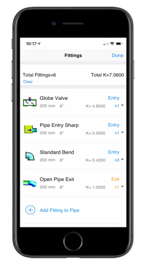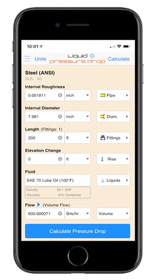 The Pressure Drop App has an intuitive user interface that allows for easy entry of the input data, including changes in elevation, and selection of valves & fittings.