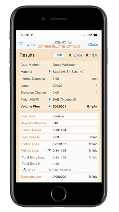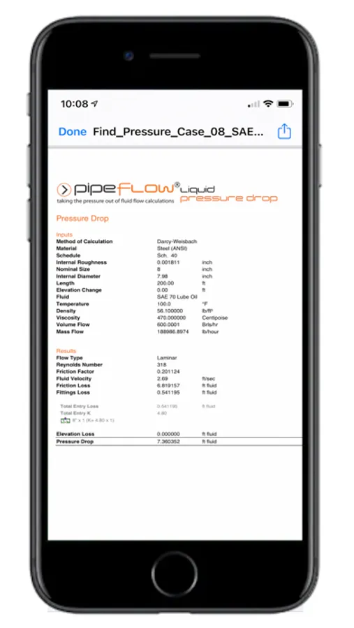 Engineers can easily perform their pressure drop calculations in the office or on site. Professional Excel and PDF reports can easily be shared with others. Results can also be saved to the library within the App.