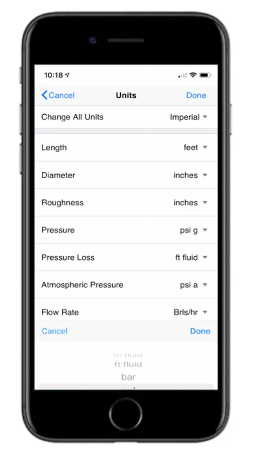 The App can operate in Imperial or Metric units and each individual field can be further customised to use a specific unit. Results values can be displayed to a specified number of decimal places.