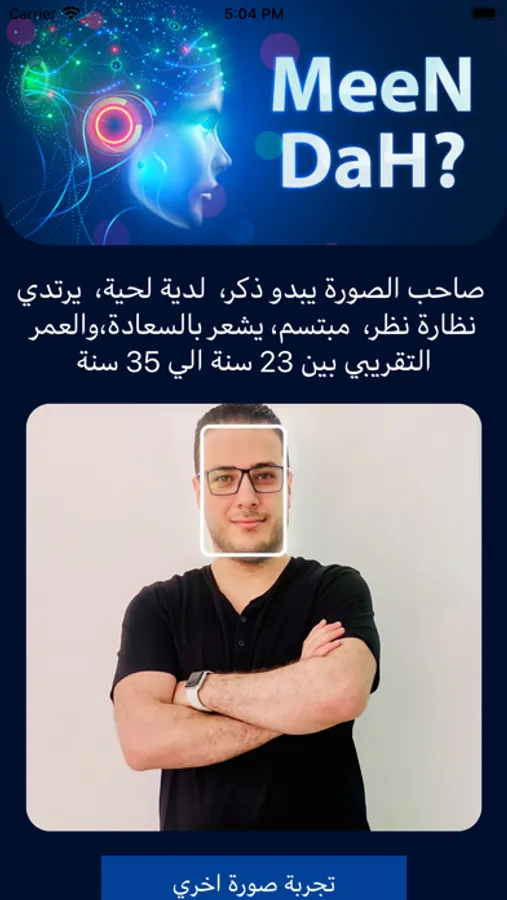 تطبيق مين دا يقوم بتحليل الصور الشخصية وعرض معلومات عنها مثل العمر التقريبي ومواصفات الوجه. كما يقوم بالتعرف علي الشخصيات المشهورة وعرض معلومات عنهم ورابط لمزيد من التفاصيل عن الشخصية. يقوم التطبيق بتحليل الصور بآستخدام تقنيات الذكاء الصناعي عن طريق خدمة Image Recognition من Amazon Web service .طبيق تحليل الصور والتعرف علي الشخصيات المشهور وعرض معلومات عنها بآستخدام تقنيات الذكاء الصناعي.