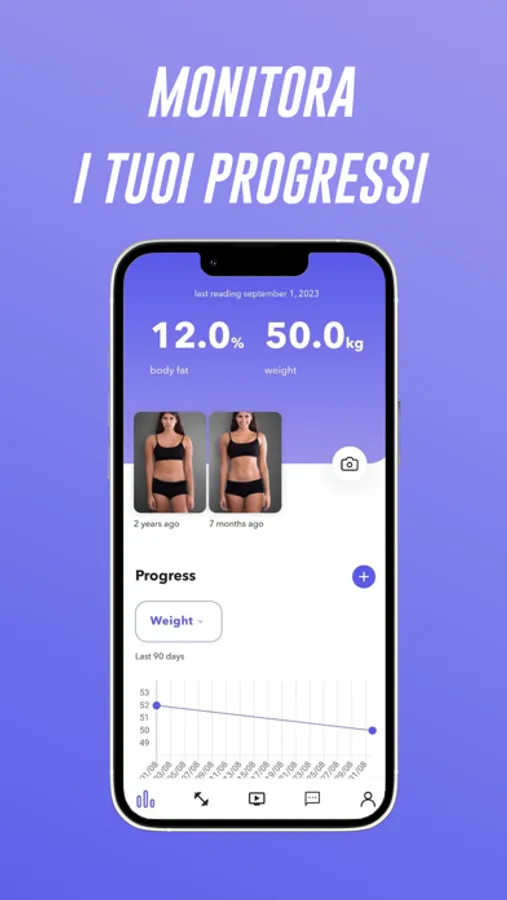 Avrai sempre sotto controllo la tua attività fisica: potrai visualizzare quali esercizi sono previsti nel tuo piano di allenamento, i tuoi progressi e come cambia il tuo fisico nel corso del tempo.