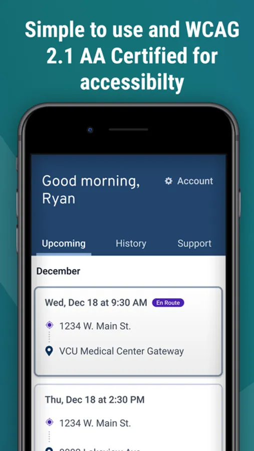 With the UZURV WCAG 2.1 AA Certified accessible Ride app, you can schedule and manage trips to fit your needs all in one place. Plus every trip is closely monitored with live support and oversight by the UZURV operations team. Track your ride as they approach your pick-up & drop-off location in real time.