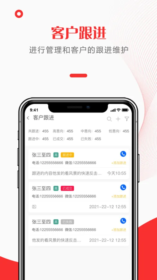 【客户跟进】公司业务员进行管理和客户的跟进维护,更轻松的管理客户,以及查看每个客户当前的跟进情况、销售情况等。