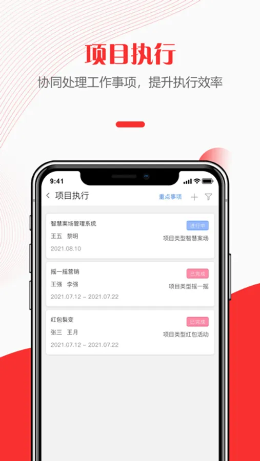 【项目执行】根据不同岗位不同权限,可在移动设备中处理负责项目的工作进度,按流程跟进工作进度,提升工作效率。