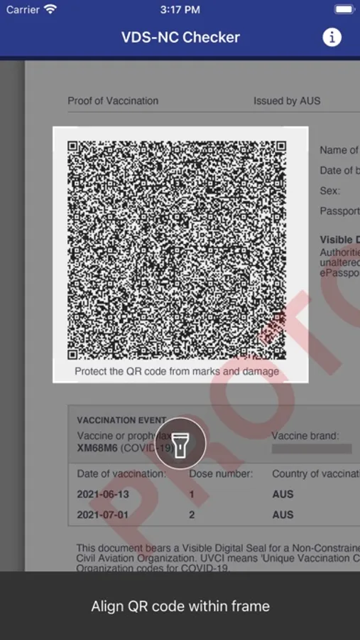 The app displays information to indicate if the QR code is not a VDS-NC, or if it is not authentic.