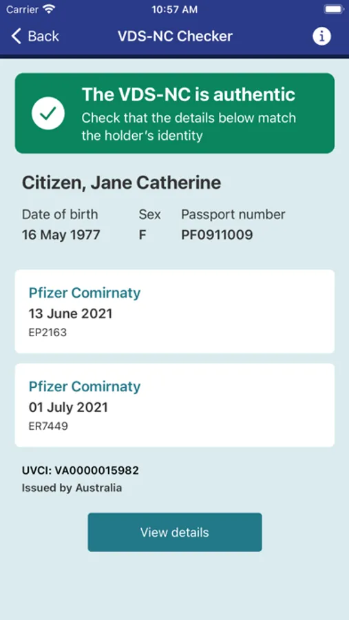 If the QR code is authentic, the app displays the most important information from the certificate, including the holder’s biodata and COVID-19 immunisations. There is an option to view the complete dataset on the certificate.